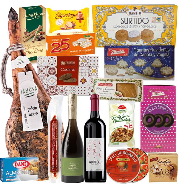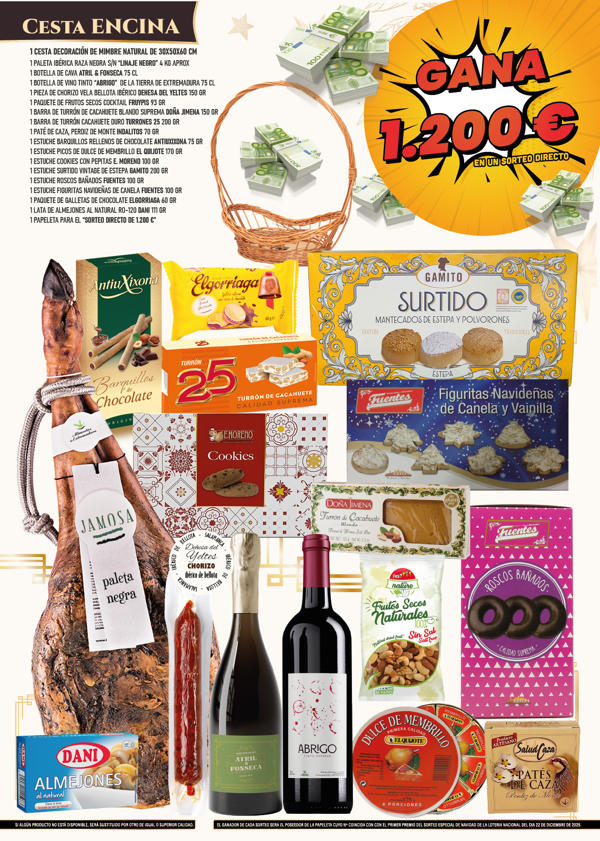 1 PALETA IBÉRICA RAZA NEGRA S/N “LINAJE NEGRO” 4 KG APROX 1 BOTELLA DE CAVA ATRIL & FONSECA 75 CL 1 BOTELLA DE VINO TINTO “ABRIGO” DE LA TIERRA DE EXTREMADURA 75 CL 1 PIEZA DE CHORIZO VELA BELLOTA IBÉRICO DEHESA DEL YELTES 150 GR 1 PAQUETE DE FRUTOS SECOS COCKTAIL FRUYPIS 93 GR 1 BARRA DE TURRÓN DE CACAHUETE BLANDO SUPREMA DOÑA JIMENA 150 GR 1 BARRA DE TURRÓN CACAHUETE DURO TURRONES 25 200 GR 1 PATÉ DE CAZA, PERDIZ DE MONTE INDALITOS 70 GR 1 ESTUCHE BARQUILLOS RELLENOS DE CHOCOLATE ANTIUXIXONA 75 GR 1 ESTUCHE PICOS DE DULCE DE MEMBRILLO EL QUIJOTE 170 GR 1 ESTUCHE COOKIES CON PEPITAS E. MORENO 100 GR 1 ESTUCHE SURTIDO VINTAGE DE ESTEPA GAMITO 200 GR 1 ESTUCHE ROSCOS BAÑADOS FUENTES 100 GR 1 ESTUCHE FIGURITAS NAVIDEÑAS DE CANELA FUENTES 100 GR 1 PAQUETE DE GALLETAS DE CHOCOLATE ELGORRIAGA 60 GR 1 LATA DE ALMEJONES AL NATURAL RO-120 DANI 111 GR 1 PAPELETA PARA EL “SORTEO DIRECTO DE 1.200 €”