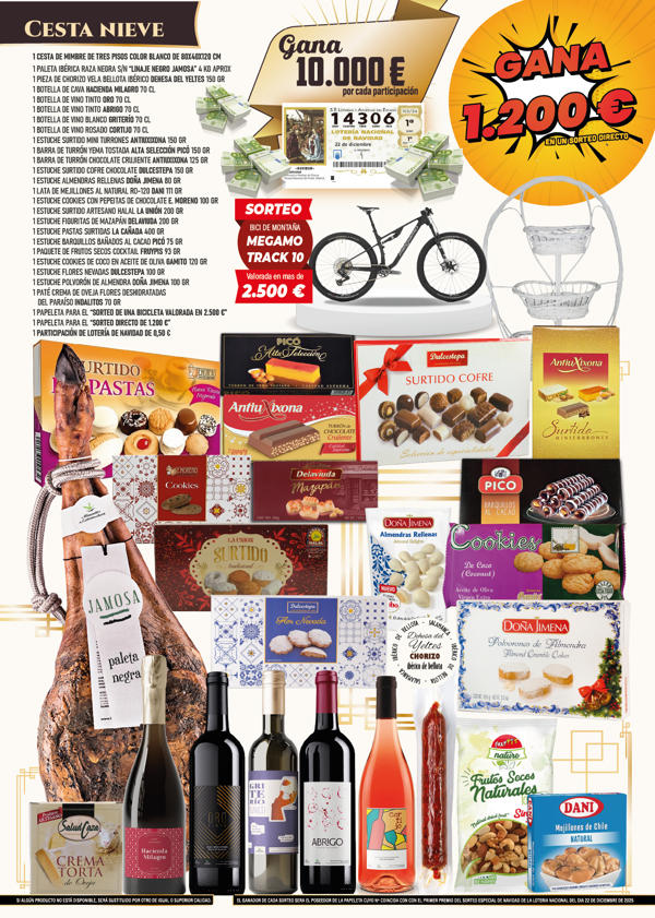 1 PALETA IBÉRICA RAZA NEGRA S/N “LINAJE NEGRO JAMOSA” 4 KG APROX 1 PIEZA DE CHORIZO VELA BELLOTA IBÉRICO DEHESA DEL YELTES 150 GR 1 BOTELLA DE CAVA HACIENDA MILAGRO 70 CL 1 BOTELLA DE VINO TINTO ORO 70 CL 1 BOTELLA DE VINO TINTO ABRIGO 70 CL 1 BOTELLA DE VINO BLANCO GRITERÍO 70 CL 1 BOTELLA DE VINO ROSADO CORTIJO 70 CL 1 ESTUCHE SURTIDO MINI TURRONES ANTIUXIXONA 150 GR 1 BARRA DE TURRÓN YEMA TOSTADA ALTA SELECCIÓN PICÓ 150 GR 1 BARRA DE TURRÓN CHOCOLATE CRUJIENTE ANTIUXIXONA 125 GR 1 ESTUCHE SURTIDO COFRE CHOCOLATE DULCESTEPA 150 GR 1 ESTUCHE ALMENDRAS RELLENAS DOÑA JIMENA 80 GR 1 LATA DE MEJILLONES AL NATURAL RO-120 DANI 111 GR 1 ESTUCHE COOKIES CON PEPEITAS DE CHOCOLATE E. MORENO 100 GR 1 ESTUCHE SURTIDO ARTESANO HALAL LA UNIÓN 200 GR 1 ESTUCHE FIGURITAS DE MAZAPÁN DELAVIUDA 200 GR 1 ESTUCHE PASTAS SURTIDAS LA CAÑADA 400 GR 1 ESTUCHE BARQUILLOS BAÑADOS AL CACAO PICÓ 75 GR 1 PAQUETE DE FRUTOS SECOS COCKTAIL FRUYPIS 93 GR 1 ESTUCHE COOKIES DE COCO EN ACEITE DE OLIVA GAMITO 120 GR 1 ESTUCHE FLORES NEVADAS DULCESTEPA 100 GR 1 ESTUCHE POLVORÓN DE ALMENDRA DOÑA JIMENA 100 GR 1 PATÉ CREMA DE OVEJA FLORES DESHIDRATADAS DEL PARAÍSO INDALITOS 70 GR 1 PAPELETA PARA EL “SORTEO DE UNA BICICLETA VALORADA EN 2.500 €” 1 PAPELETA PARA EL “SORTEO DIRECTO DE 1.200 €” 1 PARTICIPACIÓN DE LOTERÍA DE NAVIDAD DE 0,50 €